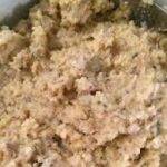 Moisten the stuffing with the milk until it comes together into a mass but not Gluggy.