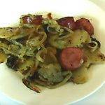 3 Immediately add sliced potatoes and onions to skillet drippings and sprinkle with seasoned salt and pepper.